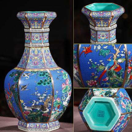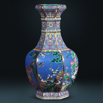 Dark blue flowers and birds hexagonal bottle